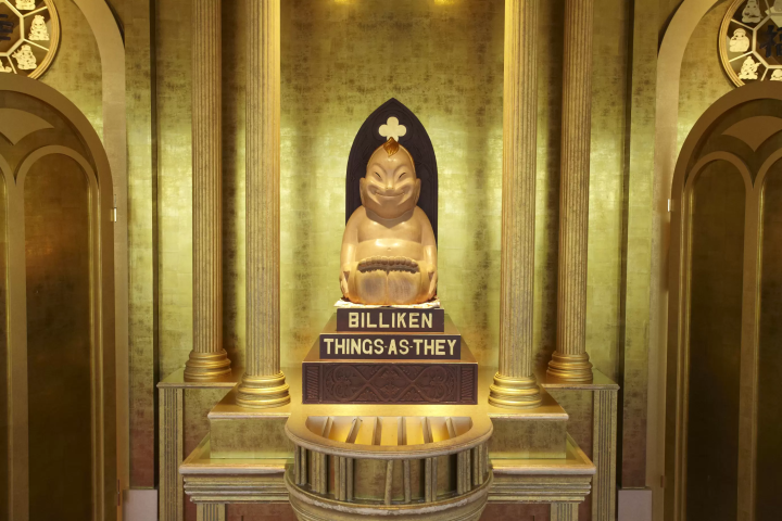 이 황금빛 사원에는 세 번째 빌리켄(잘생긴 금발 남성!)이 모셔져 있습니다. 그는 원래 쓰텐카쿠 탑에도 모셔져 있었다고 합니다. 그의 발바닥을 쓰다듬으면 소원이 이루어진다고 전해져, 사원은 사업 성공, 시험 합격, 연애 성공을 기원하는 사람들로 항상 북적입니다. 그는 칠복신 중 "팔복신"에 합류하여 쓰텐카쿠 탑의 파워 스팟으로서 오사카의 행복을 위에서 지켜보고 있습니다.